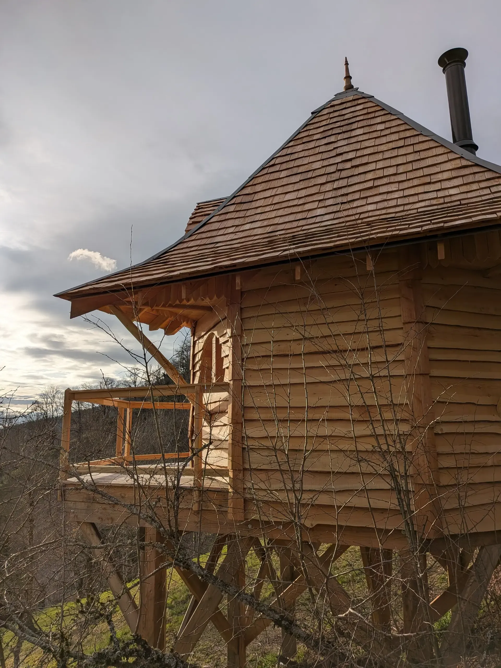Offrez-vous une escapade romantique dans une cabane insolite dans le Cantal, au cœur de l’Auvergne. Le Clocheton est un hébergement en bois conçu pour 2 personnes, idéal pour un séjour nature en amoureux. Cette petite cabane cocooning dispose d’une chambre en mezzanine, d’un espace de vie chaleureux avec poêle à bois et d’une terrasse pour profiter du coucher de soleil face aux montagnes cantaliennes. Le tarif par nuit est pour 2 personnes, petit-déjeuner inclus (servi dans la cuisine commune du domaine). Linge de lit et de bain fournis. Un séjour hors du temps en cabane en Auvergne, entre silence, nature et ciel étoilé.